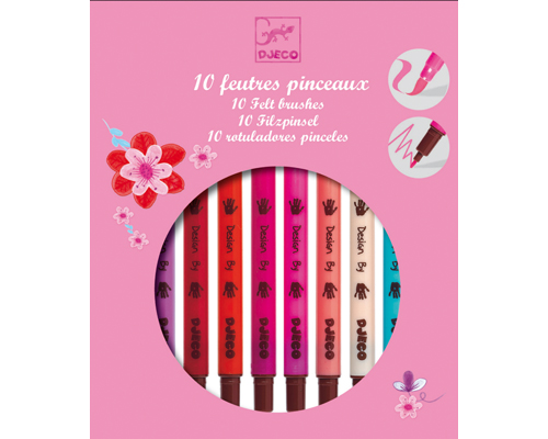 10 feutres double pointe (fine + pinceau) : lie de vin, prune, rouge, vermillon, rose foncé, rose clair, vieux rose, chair, bleu clair, violet clair.