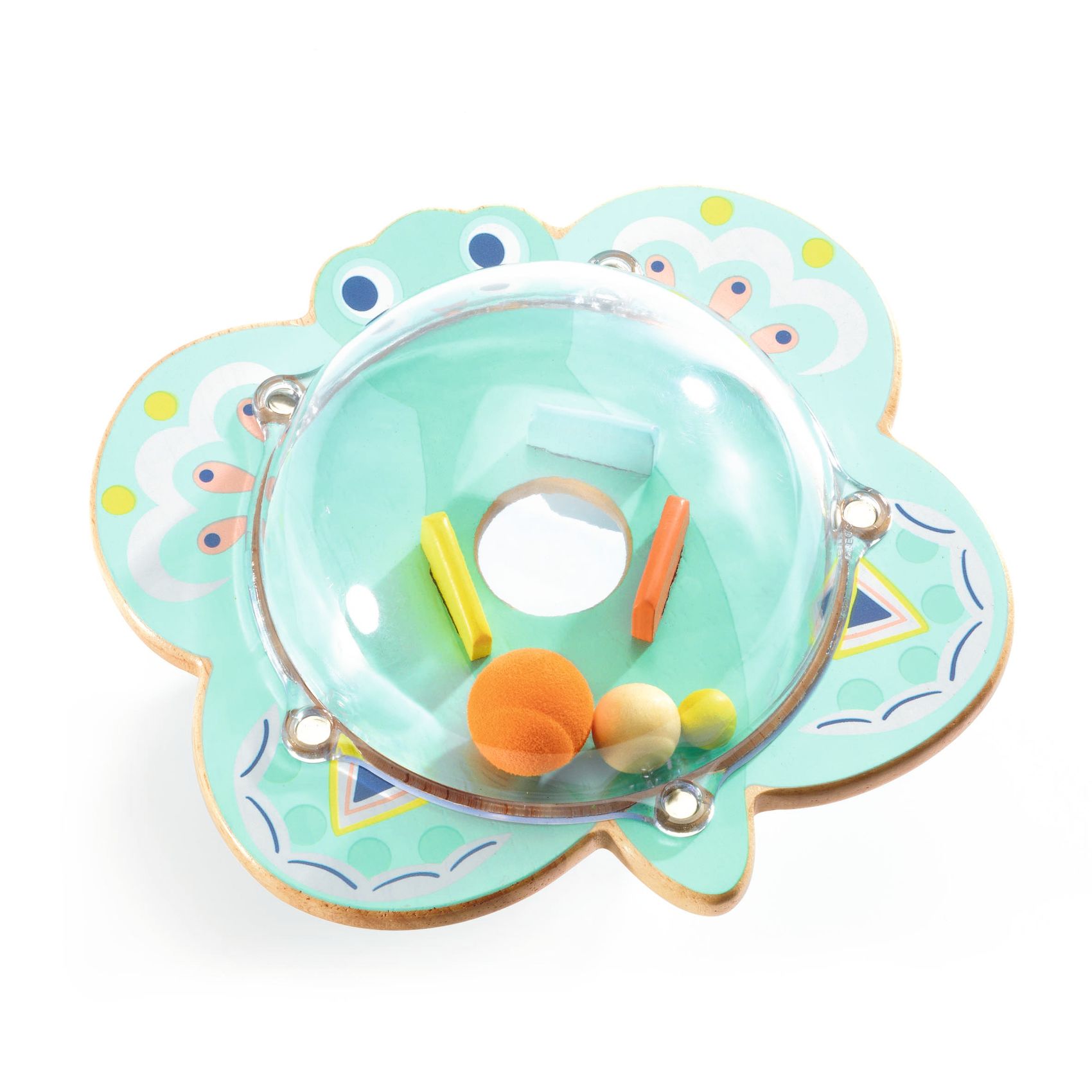 Baby Wizi est un jeu de manipulation pour les petits. Appuyé sur une table, l’enfant fait basculer la balle pour diriger facilement les billes autour des murets et vers le trou afin de les faire disparaître, puis recommence de l’autre côté avec une image et un circuit différents.