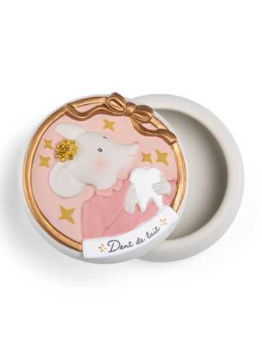 Boîte dent de lait en résine aux couleurs de la gamme avec, en volume, le portrait d’une petite souris qui conservera précieusement les premières dents de l’enfant.