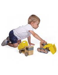 Un camion benne en bois avec benne basculante et roues silencieuses et une pelleteuse sur chenille en silicone et pelle avant à manipuler. Le godet de la pelle est adapté à la benne du camion afin que votre enfant s’improvise chef de chantier.