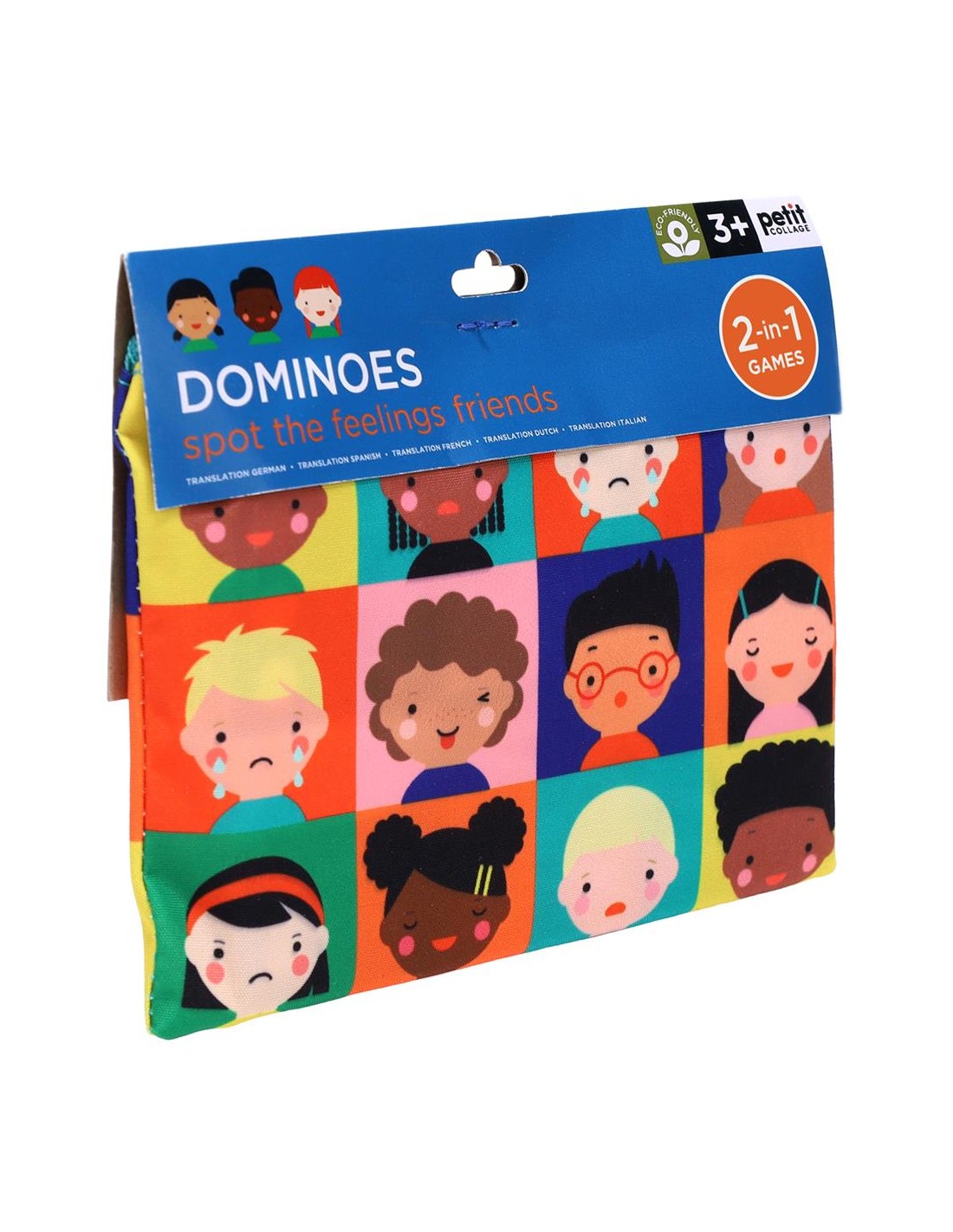 Comprend une pochette de rangement en polyester recyclé, ainsi que 28 dominos à double face.