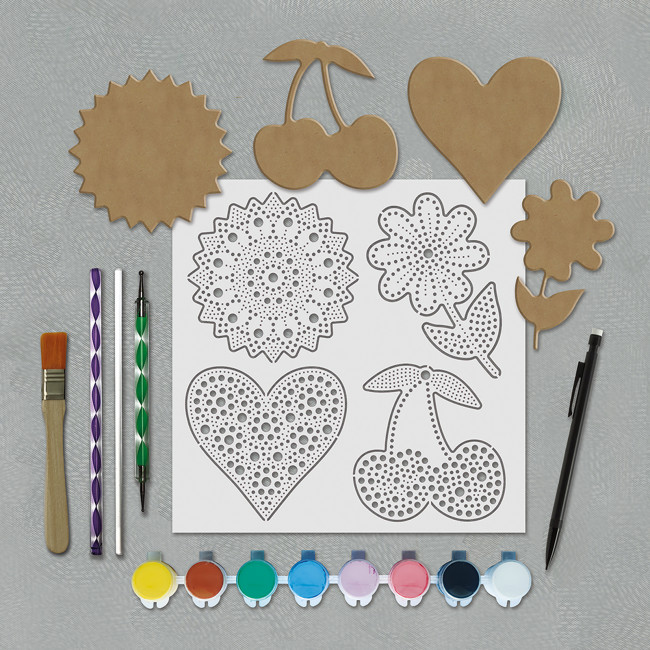 Ce coffret, permettant de réaliser 4 créations en points de peinture, est une activité à la fois créative et apaisante. Peignez chaque forme pour la colorer de la couleur de votre choix. Faites ensuite les points à l’aide du pochoir et du critérium, puis appliquez la peinture avec les outils de Dot painting permettant de réaliser différentes tailles de points.