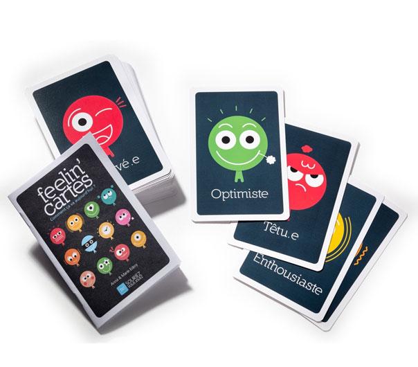 Chaque carte représente une émotion, humeur ou sensation illustrée de façon drôle et très expressive. Ces 52 « émojis » à grosses têtes ont été créés spécialement pour ce jeu, destiné autant aux adultes et professionnels de l’accompagnement qu’aux enfants.