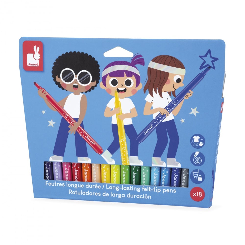 Ajoutez de la couleur à chaque création ! Ce set de 18 feutres offre une palette de couleurs lumineuses qui donnent vie aux dessins des enfants.