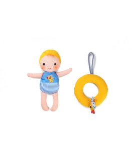 Cette poupée en polyester de 18 cm rendra l’heure du bain encore plus amusante ! Autour de sa taille se trouve une bouée jaune ornée d’une tête de canard.