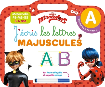 Un ouvrage en forme d’ardoise pour apprendre à écrire les lettres majuscules avec le feutre effaçable grâce à des modèles et des lettres rugueuses à toucher, autour de l’univers de Miraculous.