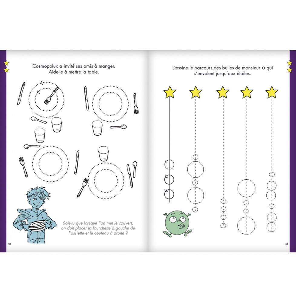 De plus, Mon cahier de graphisme propose des activités dont le niveau est progressif, avec un ordre de difficulté de 1 à 3 étoiles, pour que l’enfant puisse progresser à son rythme.