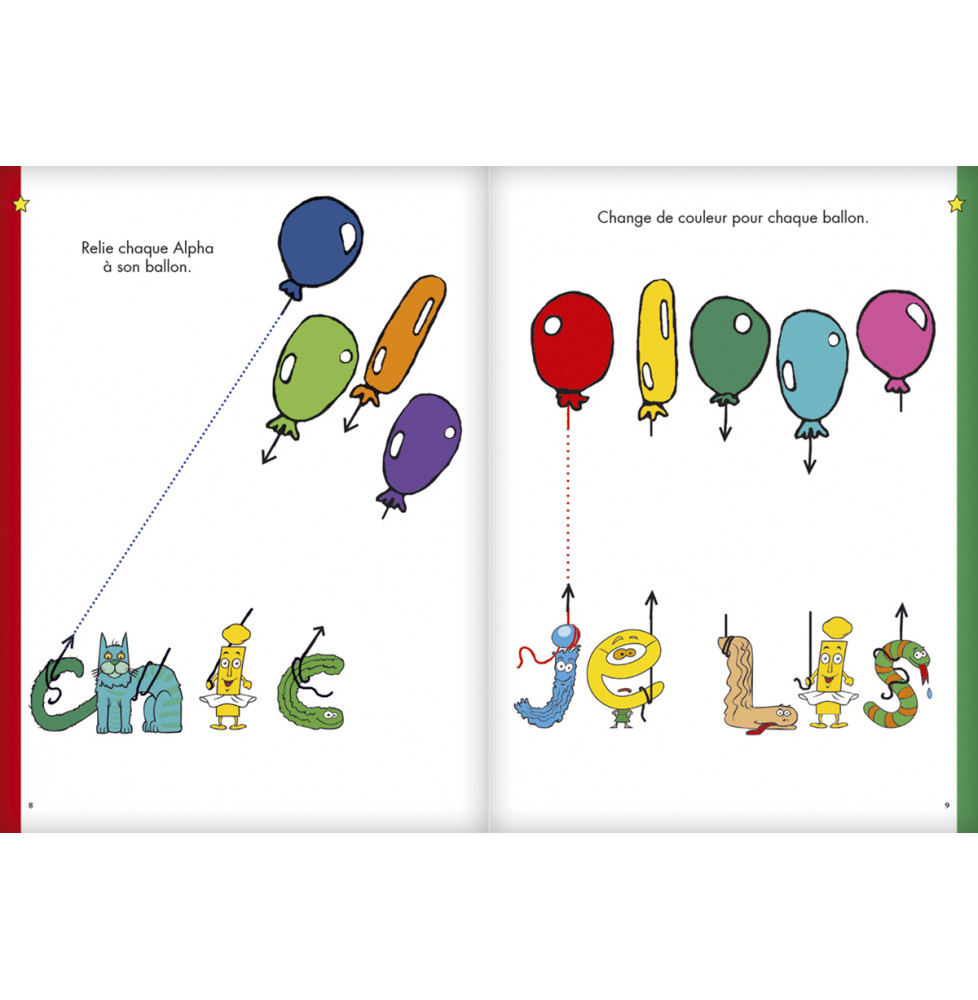 Pour donner envie à l’enfant de s’entraîner, il est accompagné à chaque page par les personnages des Alphas. Ainsi, les activités proposées sont ludiques et diversifiées : dessiner les bulles de monsieur o, repasser sur les pointillés de la canne de monsieur a, relier chaque Alpha à son ombre, tracer des cordes pour relier le nez à madame é, repasser sur les pointillés des lettres après la transformation des Alphas…