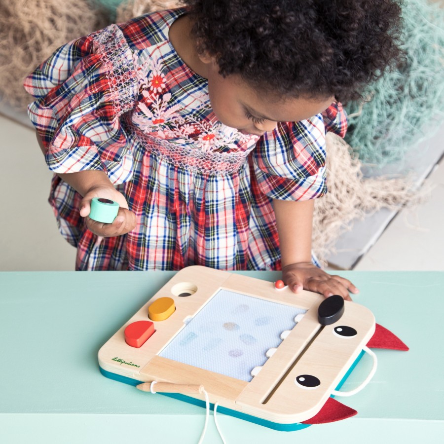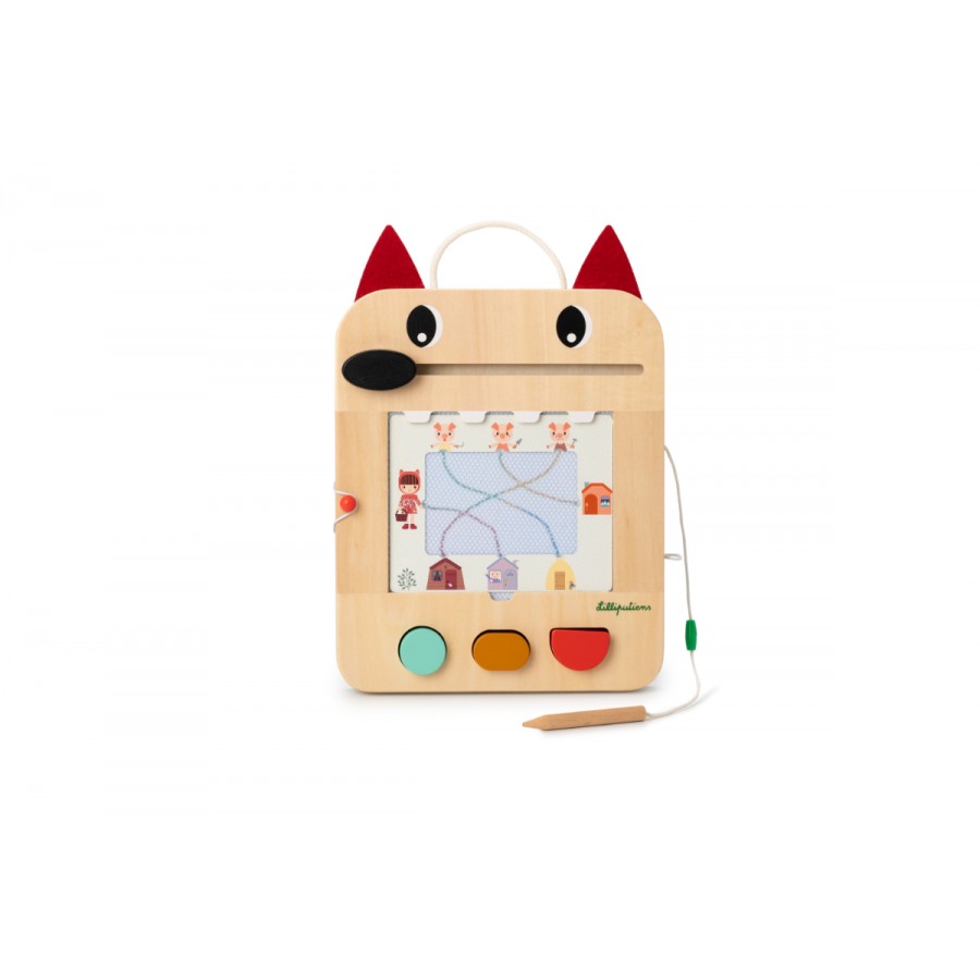Le tableau magique de Louis le loup offre un plaisir infini de dessin et de jeu. Différentes couleurs, 3 tampons avec des formes géométriques, 6 cartes avec 12 jeux et un crayon en bois stimulent les petites mains et les esprits. Une erreur ou une envie de faire un nouveau dessin ? Alors, le museau de Louis efface le tableau. Les cartes de jeu sont rangées à l’arrière dans la fente prévue à cet effet et le crayon en bois est attaché à une corde pour ne pas le perdre.