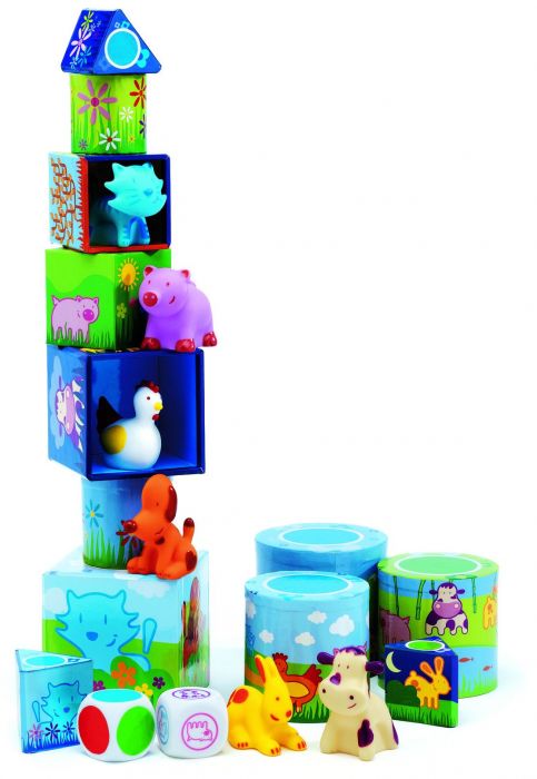 Et enfin, un jeu d’adresse: avec les cubes, les animaux et les dés, les joueurs réalisent la plus haute tour possible.