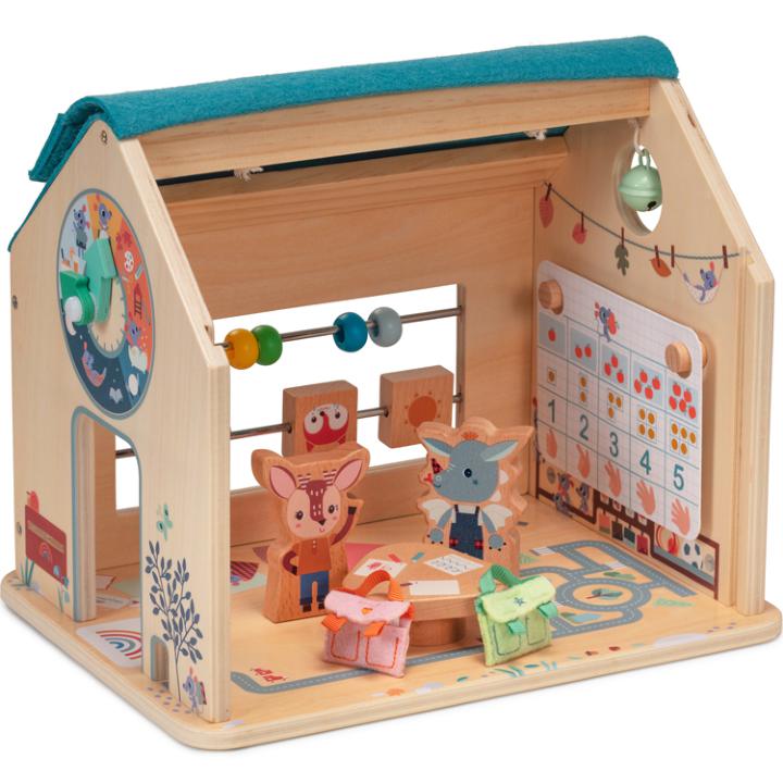 Le toit de l’école s’ouvre et dévoile alors une salle de classe pleine de surprises et de jeux à se raconter. Un emplacement est prévu pour le tableau où l’enfant pourra changer les notions étudiées (3 planches recto-verso). Un mini boulier ainsi que des formes à déplacer sont présents dans la classe tout comme une petite clochette sonnant la récréation. Une fois l’heure de la pause sonnée, un pan de mur peut se retirer et ainsi révéler la cour de récré. Joe et Stella peuvent alors poser leur cartable et leur carnet de liaison pour aller s’amuser et jouer à la marelle. Une multitude d’autres détails colorés sont à découvrir sur les pans de murs ou à l’intérieur de la classe. L’ensemble des pièces qui composent ce jouet peuvent être rangées à l’intérieur de Ma Première École Lilliputiens, et l’anse dont elle est pourvue permet de l’emmener partout, facilement.