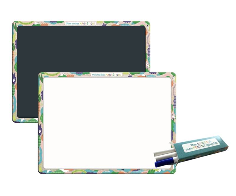 Un grand tableau magnétique en bois : blanc au recto, ardoise au verso. A suspendre à la chambre grâce à son cordon, il est idéal pour compléter notre collection de pochettes d’aimants.