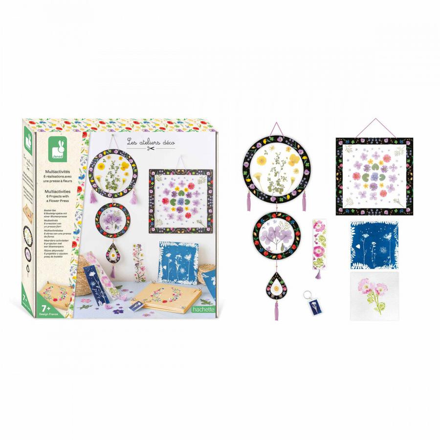 Pour une déco naturelle et fleurie à offrir, découvrez ce set idéal pour les enfants à partir de 7 ans. Grâce à la belle presse à fleurs en bois, les enfants pourront réaliser : un attrape-rêve, des marque-pages, un porte clés, des tableaux sur papier photosensible (qui permet de faire ressortir les contours des feuilles et des fleurs) et des tableaux en tataki zomé (technique d’impression).