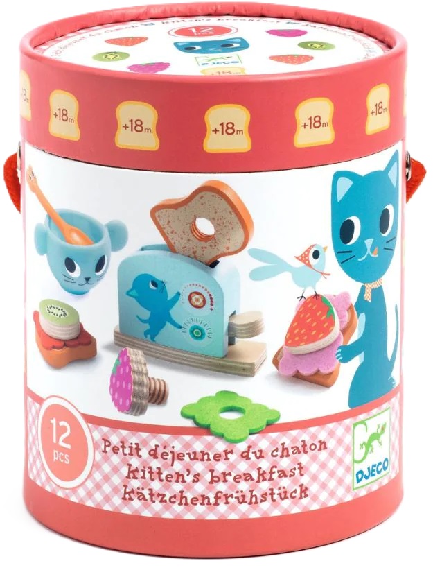 Dans 1 baril en carton : 3 toasts en bois, 3 fruits en bois à visser, 3 pièces de feutrines « confiture », 1 toaster, 1 tasse et 1 petite cuillère.