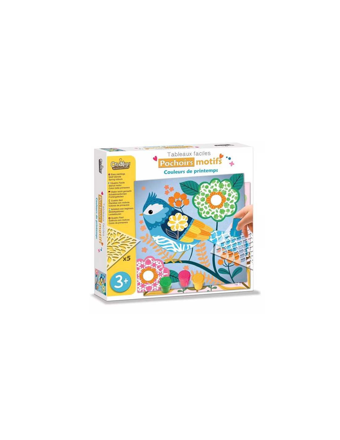 Découvrez le coffret Pochoirs motifs couleurs du printemps de Créalign’, une activité créative pour les enfants à partir de 3 ans qui vont créer 5 tableaux d’animaux en les décorant de motifs avec des pochoirs. Un coffret idéal pour développer le sens artistique des jeunes enfants.