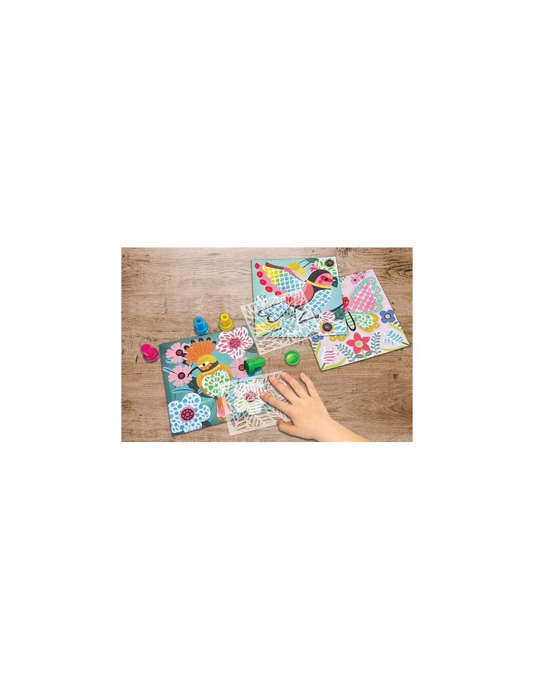 Il contient 5 jolies cartes d’animaux annonçant l’arrivée du printemps (colibri, papillon, mésange, libellule, rouge-gorge). Pour décorer les cartes il faudra venir tamponner soigneusement les motifs à travers les pochoirs (lavable à l’eau savonneuse). Grâce au chevalet fourni les enfants pourront exposer leur tableau.