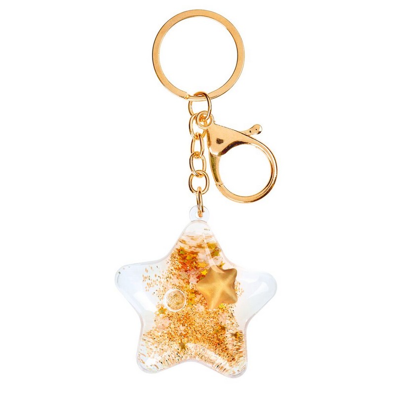 Un porte-clés doré avec une étoile remplie de paillettes et d’eau et une figure comme une licorne, un ours polaire ou une étoile dorée. Joli porte-clés amusant.