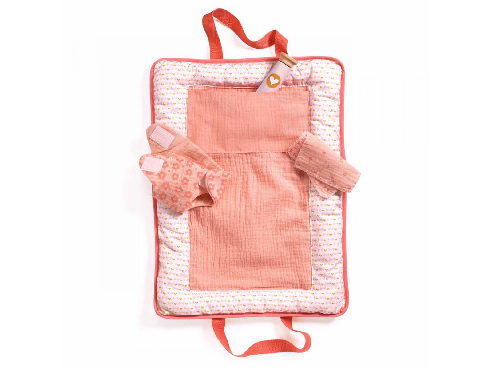 Le sac à langer est doté d’une poche intérieure qui contient une couche lavable, deux lingettes en tissu doux pour l’essuyage et un tube de crème en bois – des accessoires essentiels à avoir toujours avec soi. Le sac à langer est décoré à l’extérieur d’une applique en forme d’oiseau et convient aux poupées de 30 à 36 cm.