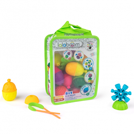Coffret de perles 28 perles dont 2 animaux Birdy l’oiseau et Bob le cochon . Les perles LALABOOM permettent aux enfants de découvrir et développer leurs compétences, et participent à l’apprentissage de la motricité grâce à des grosses perles multicolores qui se vissent, se clippent, s’assemblent ce lacent pour construire une multitudes de chenille.