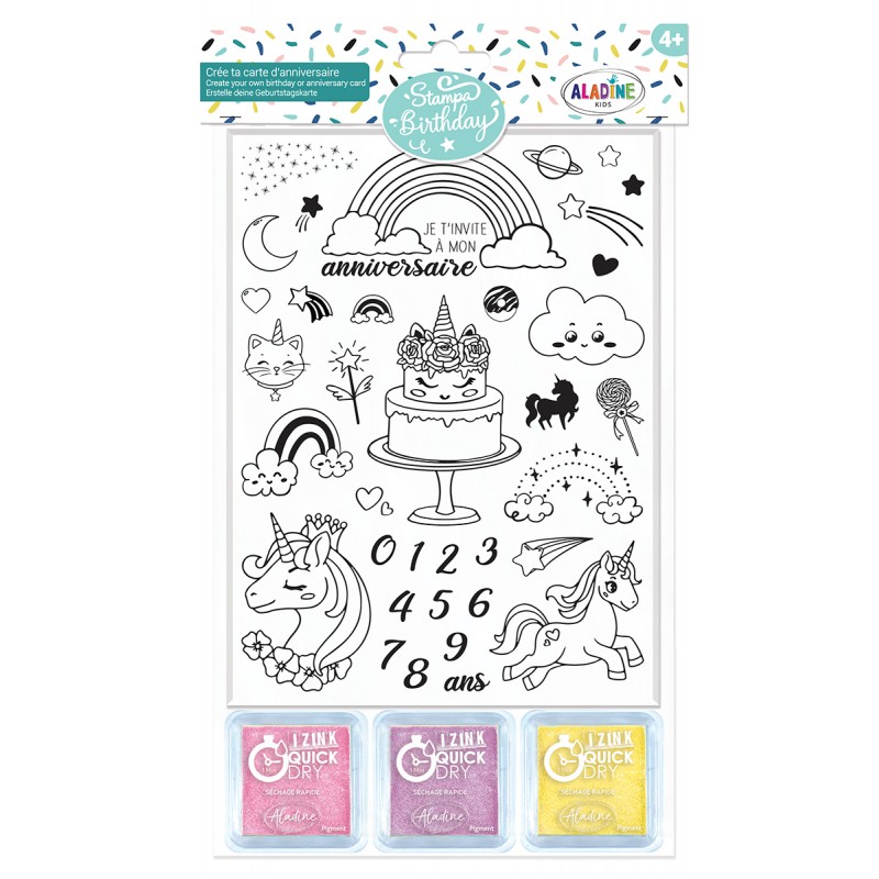 une dizaine de tampons sur les thèmes préférés des enfants (licorne) et 3 encreurs assortis