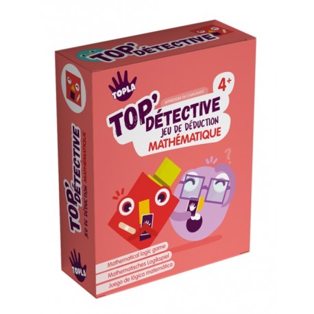 Jeu de déduction mathématique autour des formes géométriques pour les plus jeunes. Chaque joueur a un jeu de cartes complet étalé devant lui, faces découvertes. Au fur et à mesure que l’on pose des questions (Est-ce que ton personnage a une tête ronde?) on retourne les cartes qui ne correspondent pas, jusqu’à ce que l’on pense avoir trouvé le personnage secret. Conçu pour 2 joueurs, Top’Détective peut facilement se jouer en équipe. Ce jeu fait par appel à la reconnaissance des formes, à la logique et à la verbalisation.
