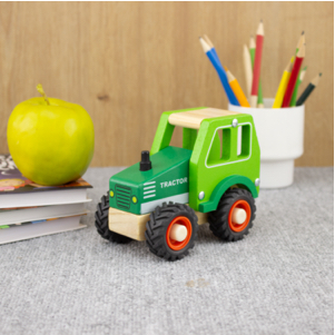 Petit tracteur en bois naturel. Pour bien accrocher, les roues sont en matière plastique.