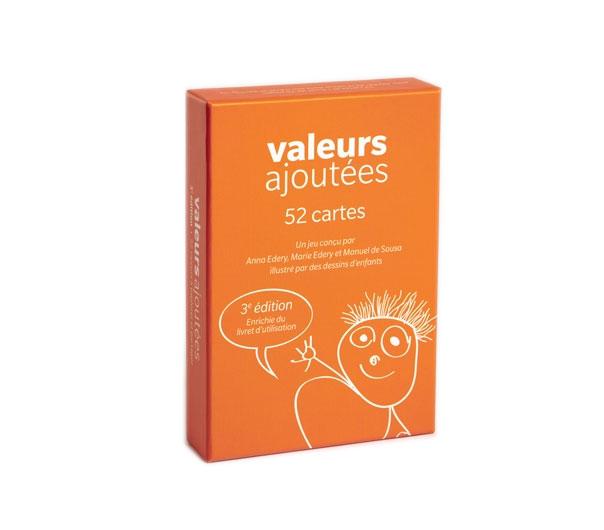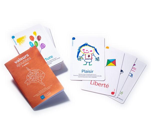 Valeurs ajoutées fait un jeu de ce qui nous anime et nous unit : nos valeurs. Ce jeu de 52 cartes grand format est conçu pour être utilisé aussi bien par les acteurs de l’entreprise et des ressources humaines (DRH, formateurs, coachs, thérapeutes) que par les particuliers.