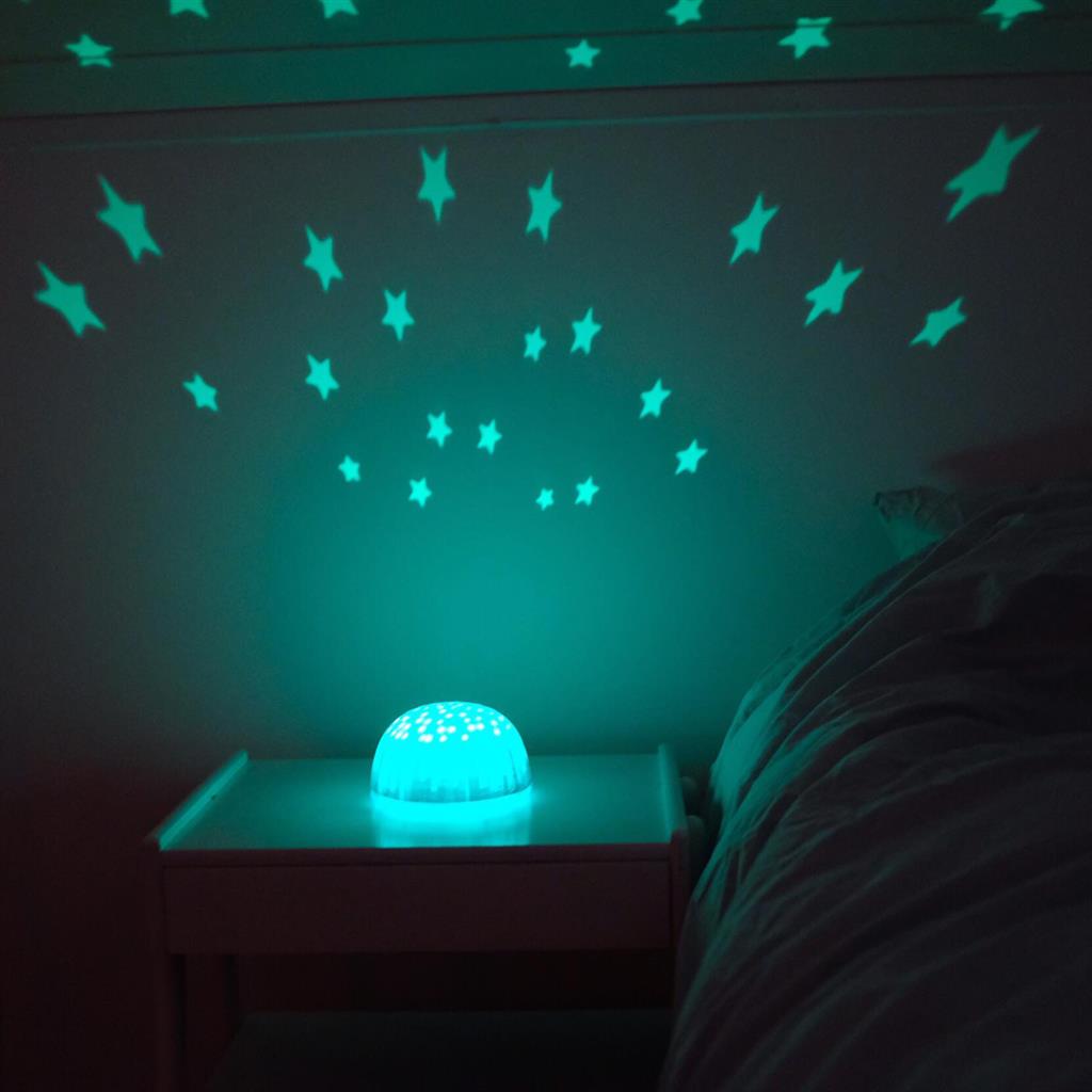 Une boite à musique, veilleuse et projecteur d’étoiles, qui diffuse une agréable lumière douce sur les mur. Il y a différents modes de couleurs et un mode qui change de couleur ainsi qu’un timer. On peut également choisir parmi 5 mélodies proposées, régler le volume souhaité ou tout simplement ne laisser que la lumière sans musique.