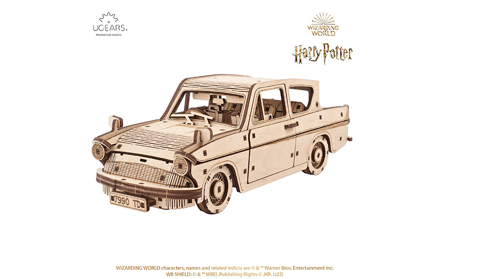 La Voiture Volante Ford AngliaTM Ugears est dotée d’un entraînement à ressort qui transmet le couple aux roues arrière, fournissant ainsi la puissance motrice.