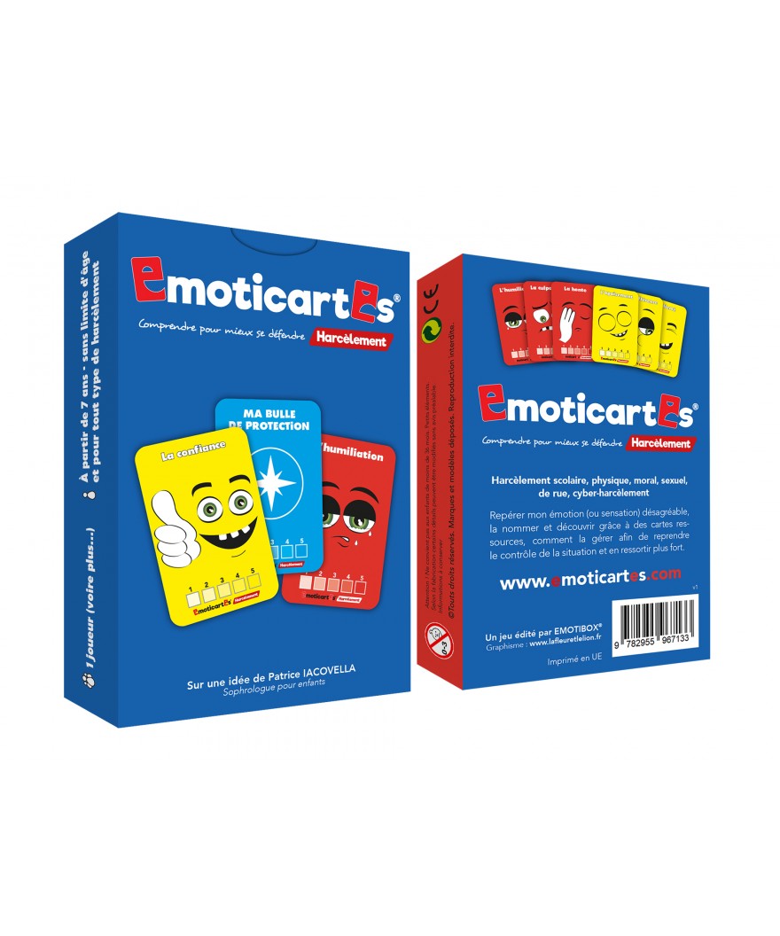 À partir de 7 ans et sans limite d’âge les EMOTICARTES HARCELEMENTS sont un outil ludique puissant pour comprendre, faire face et gérer les situations de harcèlements et retrouver confiance, estime de soi, sécurité, apaisement.