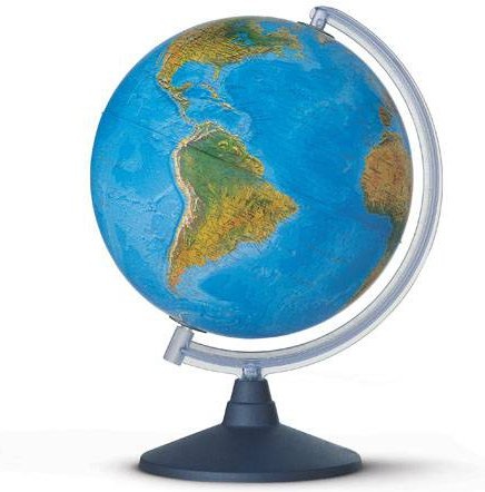 Globe terrestre Nova Rico Elite. Mappemonde géographique lumineuse munie d’un double effet : la géographie est physique quand le globe est éteint et allumé, il devient politique. Pied et méridien en plastique.