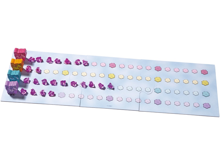 Jeu de piste et de collecte féerique. Chaque joueur à son tour jette le dé bleu et fait avancer sa licorne du nombre de nuages indiqué. Si la licorne s’arrête sur un nuage rose, le joueur jette le dé rose et gagne le nombre de cristaux indiqués. S’il s’agit d’un nuage avec un cadeau, le joueur prend un cristal et l’offre au joueur de son choix. Le premier qui atteint le nuage d’arrivée gagne un bonus de 4 cristaux. Le gagnant est celui a collecté le plus grand nombre de cristaux. Si les enfants ne savent pas les compter, ils retournent le plateau et placent les cristaux sur les lignes de nuages pour comparer les quantités.
