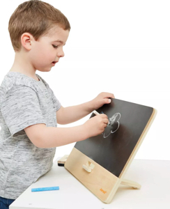 Livré avec tous ses accessoires (3 craies et 1 brosse), c’est un tableau en bois pratique à poser où on le souhaite ! Doté d’un pied amovible à l’arrière, ce tableau à poser permet aux enfants de dessiner à hauteur des yeux.
