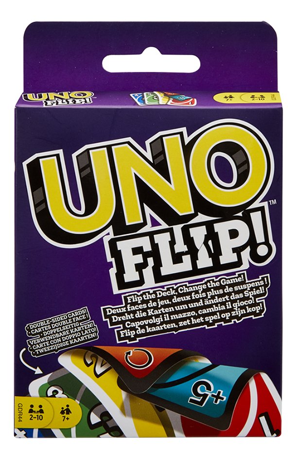 Prépare-toi pour une version folle du célèbre jeu UNO ! Car si tu joues une carte Flip, tout le monde doit retourner ses cartes et continuer à jouer avec le côté Lumineux ou Obscur !